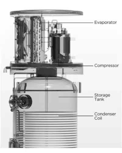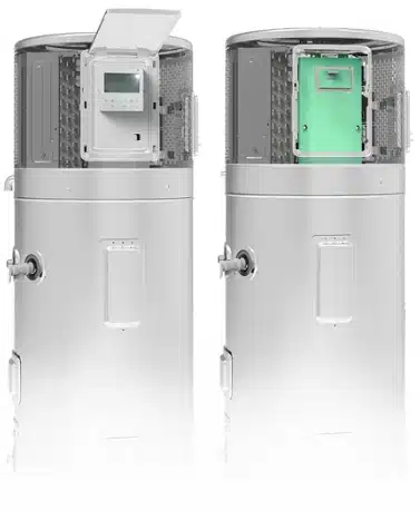 Modern and stylish, a single piece unit incorporates a top-mounted compressor with compact footprint. It generates considerably more heat energy than the energy consumed, leading to savings on purchased